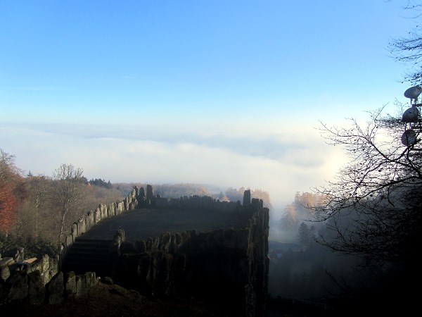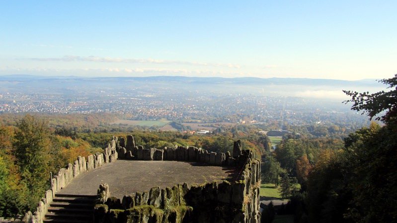 11. Oktober 2012 - 10:20 Uhr: Der Herbst ist eingezogen. Unter löst die Herbstsonne gerade den letzten Nebel über dem Kasseler Becken auf (Standpunkt: frei zugängliche "Oktogonbasis" wie oben).