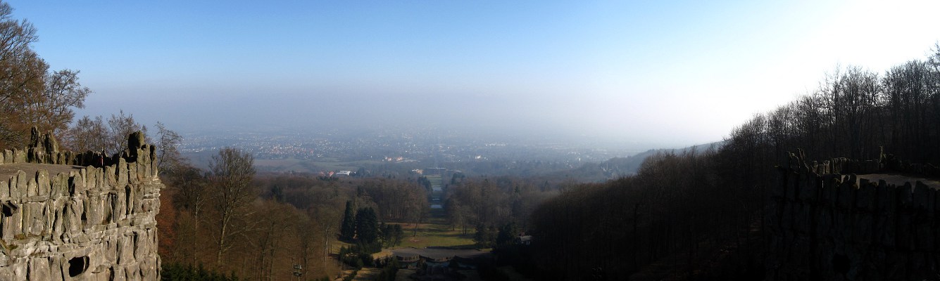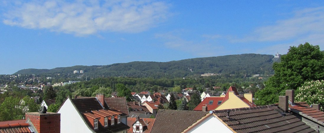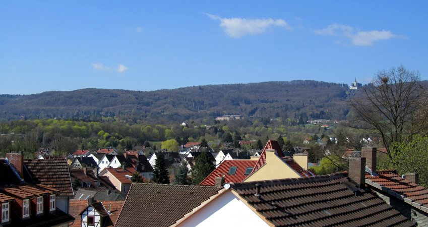 8. April 2011: Der "große" Frühling erwacht langsam. Aus dem Bereich Kassel-Kirchditmold reicht dieser Blick über die Dächer bis zum Habichtswald. Im Stadtbereich auf 200 bis 250 m Höhe sind schon einige Bäume grün gekleidet. Obem am Kamm des Habichtswald auf 500 bis 550 m Höhe ist es noch nicht ganz so weit. Der Herkules ist rechts oben in klein zu erkennen. Fasst genau in der Bildmitte liegt Schloss Wilhelmshöhe.