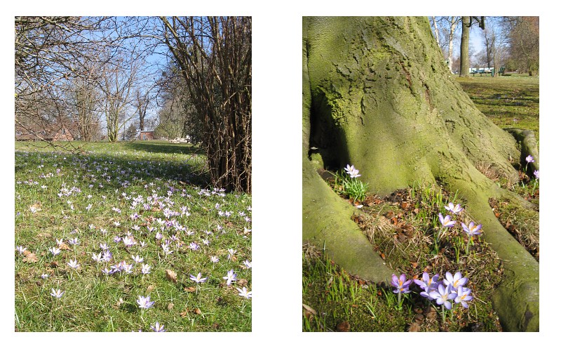 18. März 2010: Frühlingserwachen im botanischen Garten: Die Wiesen sind mit einem Teppich aus Krokussen übersäht. Besonders das milde Mikroklima an der südlichen Stammseite der großen Rotbuche wissen die Frühjahrsboten natürlich zu schätzen. Bis es allgemein "grünt", heisst es aber noch ein bißchen warten.
