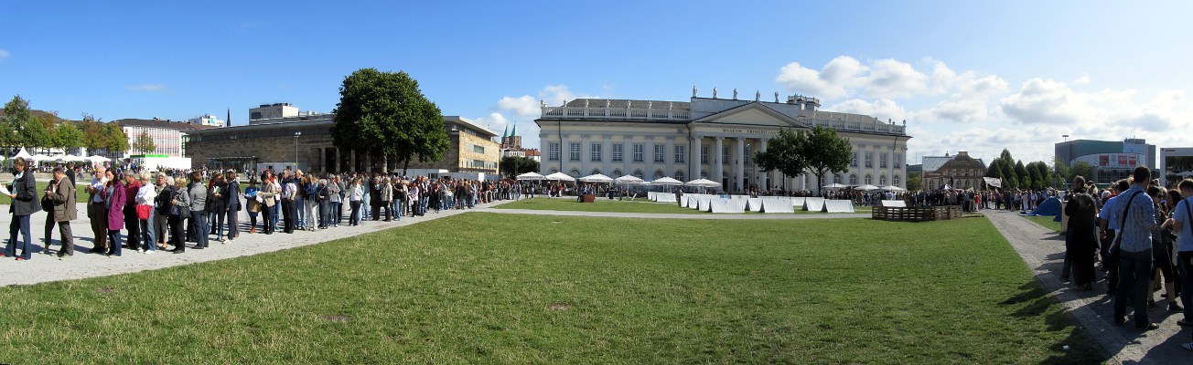 1. September 2012: "Documenta-13-Warteschlangen-Studie" am Friedrichsplatz. Alle 5 Jahre verändert sich mit der Documenta das Bild der Kasseler Stadtmitte: Zahlreiche Kunstfreunde aus aller Welt beleben dann für 100 Tage die Fuldastadt. Gegen 9:50 Uhr betrugt die Wartezeit zum Fridericianum etwa 1 bis 1 1/4 Stunden. Im Fridericianum gab es am "Brain", einem speziellen Ausstellungsraum zu den Leitthemen der Documenta 13 übrigens noch einmal gute 30 Minuten Wartezeit ... |