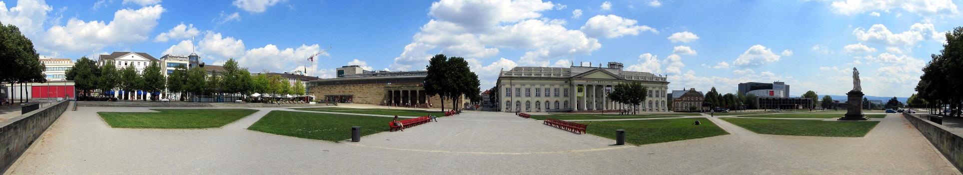 Im Juli 2011: Sommer am Friedrichsplatz in der Stadtmitte. Der weite Platz ist mit die erste Anlaufstelle für Besucher in der Stadtmitte. In der Mitte rechts liegt das historische Gebäude des Fridericianums. Ganz rechts das Denkmal Landgraf Friedrich II. Die roten Bänke in der Bildmitte stammen übrigens von der Documenta 12 aus dem Jahr 2007. |