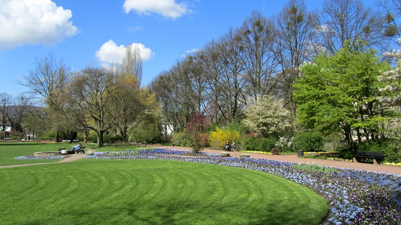 15. April 2011: Frühling im Stadthallengarten. Die kleine Parkanlage hinter der Stadthalle präsentiert sich herausgeputzt. Wer z. B. als Konferenzteilnehmer in der Stadthalle zu Gast ist, kann hier während der Mittagspause schön zwischen den Blumenteppichen entspannen.