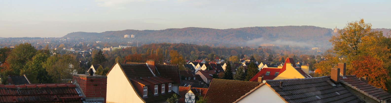 20. Oktober 2012: herbstlicher Morgenblick von Kassel-Kirchditmold über die Dächer zum Habichtswald.