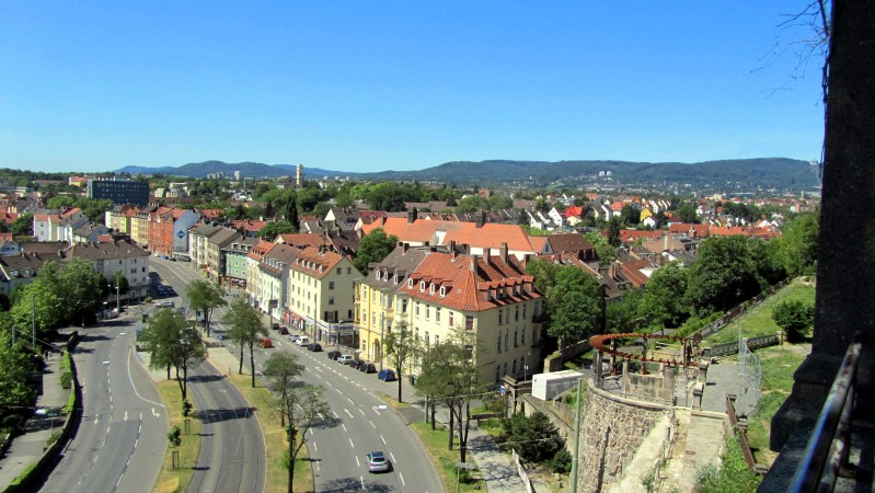 2. Juni 2010: Blick vom Weinberg über die Südstadt zum Habichtswald. Unten die Frankfurter Straße, die die Stadtmitte von Süden her erschließt.