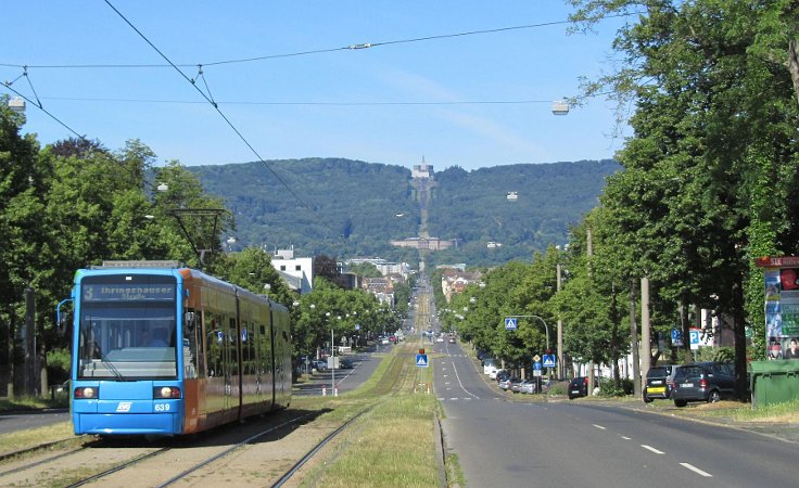 26. Juni 2011: Frühsommer an der Wilhelmshöher Allee. Von der Haltestelle "Weigelstraße" reicht der Blick entlang der Kasseler Stadtachse bis zum rund 6 km entfernten Herkules. Die Straßenbahn, in Kassel kurz "Tram" genannt, verkehrt bereits seit 1877 entlang der "Willi Allee". Die Stadtachse wurde zwischen 1767 und 1778 als Teil der Bergparkkonzeption angelegt um diesen planerisch mit der Stadtmitte zu verbinden. Damals war das Gelände entlang der Straße noch weitgehend unbebaut.