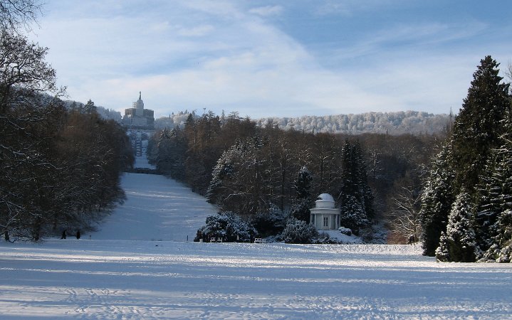 5. Januar 2010: Der Bergpark ist weiß überpudert. Der Blick reicht vom Plateau des Schlosses Wilhelmshöhe bis zum 300 m höher gelegenem Oktogon, auf dem der Herkules mit seiner Pyramide thront. Oktogon und Herkules sind eingerüstet, da sie saniert werden (seit dem Jahr 2006).