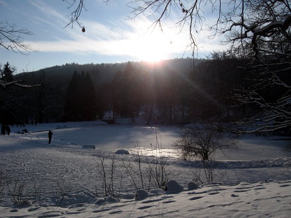 5. Januar 2010: Am Fontänenteich versinkt die Wintersonne schon früh hinter den Ausläufern des Habichtswaldes. Das Motiv wurde aus dem Bereich der grünen Bankansammlung am Teich aufgenommen. Bereits im zeitigem Frühjahr kann man hier schön die ersten Strahlen der wärmenden Frühlingssonne genießen.